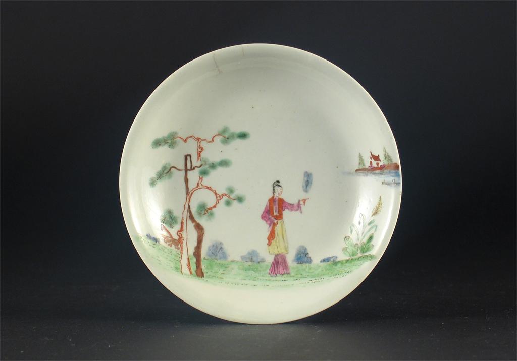 An early Worcester saucer, painted with a Chinese lady holding a fan beside a pine tree, workman's marks. Two rim cracks and restored chips. c.1755, 12cm.