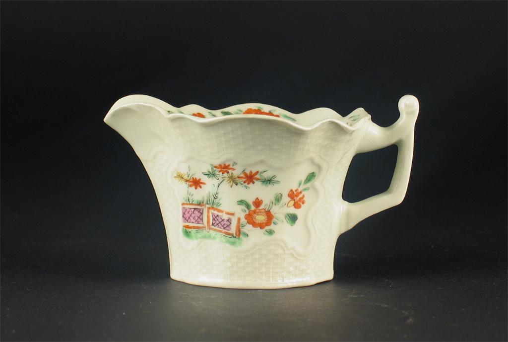 A Worcester basket moulded cream boat, each side painted with bamboo and peony issuing from a fence, unmarked. Some good restoration to the rim. c.1755, 10cm. Long.