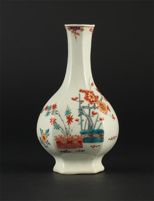 An early Worcester hexagonal-section small bottle vase, painted in the Kakiemon style with prunus and bamboo growing behind banded hedges, the reverse with a flower. A body crack to the reverse. c.1753-5, 11.5cm. Cf. Spero & Sandon, The Zorensky Collection, no.48.