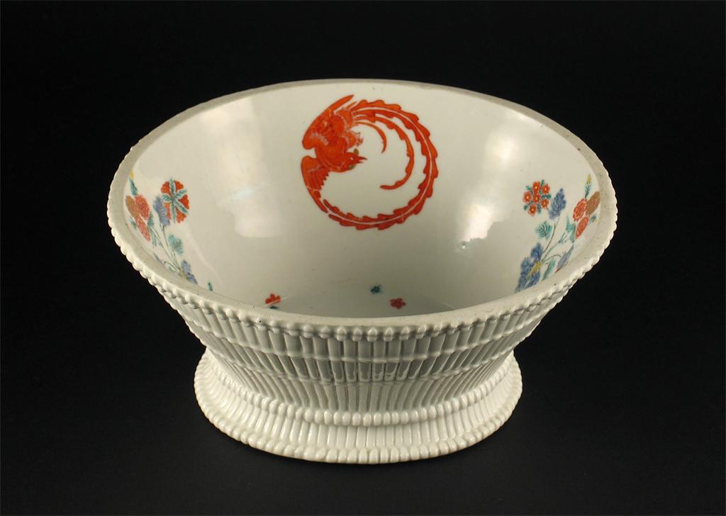 A Chelsea oval basket, the interior painted in the Kakiemon style with flowers and phoenix rondels, unmarked. The rim ground. c.1755, 20cm.