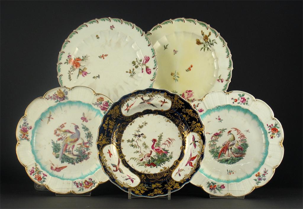 Five Chelsea plates, three painted with birds and two with flowers within feather borders, gold and brown anchor marks. Cracks, chips, wear and restoration. c.1760-69, 22cm. (5)