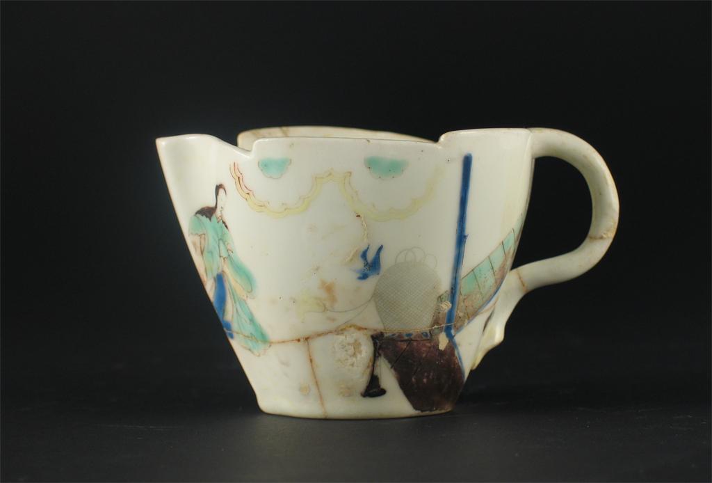 A rare Chelsea peach-shaped cream jug, painted with the 'Lady in a Pavilion' pattern, raised anchor mark. Previously riveted, misfired and extensively damaged. c.1750, 10.5cm.