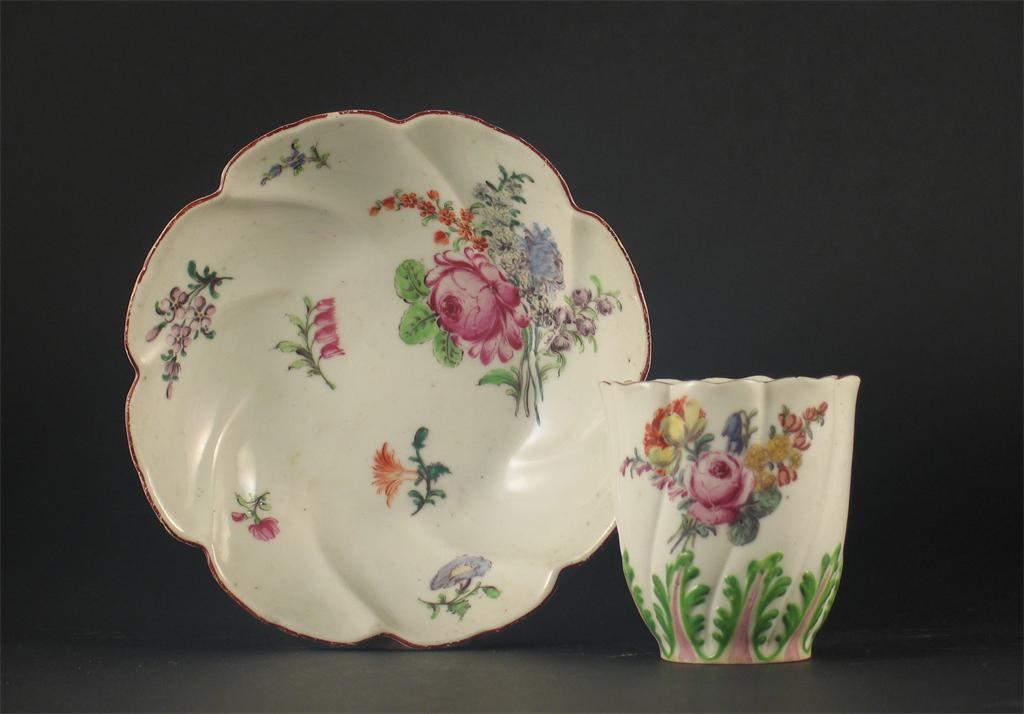 A Chelsea spiral moulded beaker and saucer, moulded with bands of acanthus leaves and painted with scattered flowers, brown line rims, the saucer with a red anchor mark. The beaker with small rim chips. c.1755. (2)