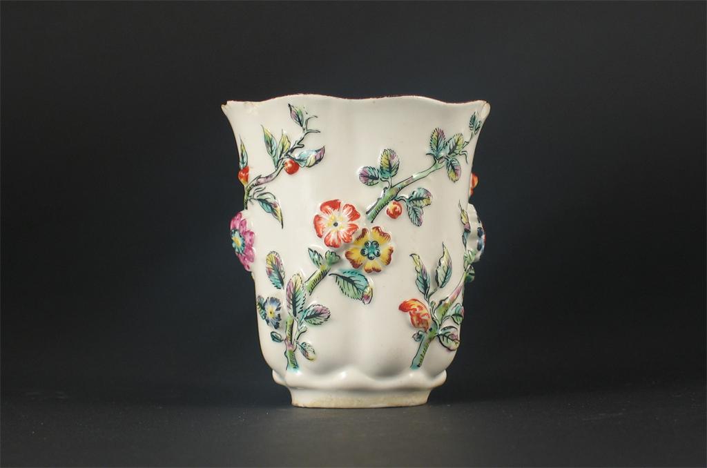 An early Chelsea beaker, with a fluted body moulded with spiralling flower stems, picked out in bright coloured enamels, the undulating rim with a brown line, unmarked. Small rim chips and a 2cm hair crack. c.1745-50, 7.5cm. Cf. J Austin, Chelsea Porcelain at Williamsburg, no.20 for a similar beaker.