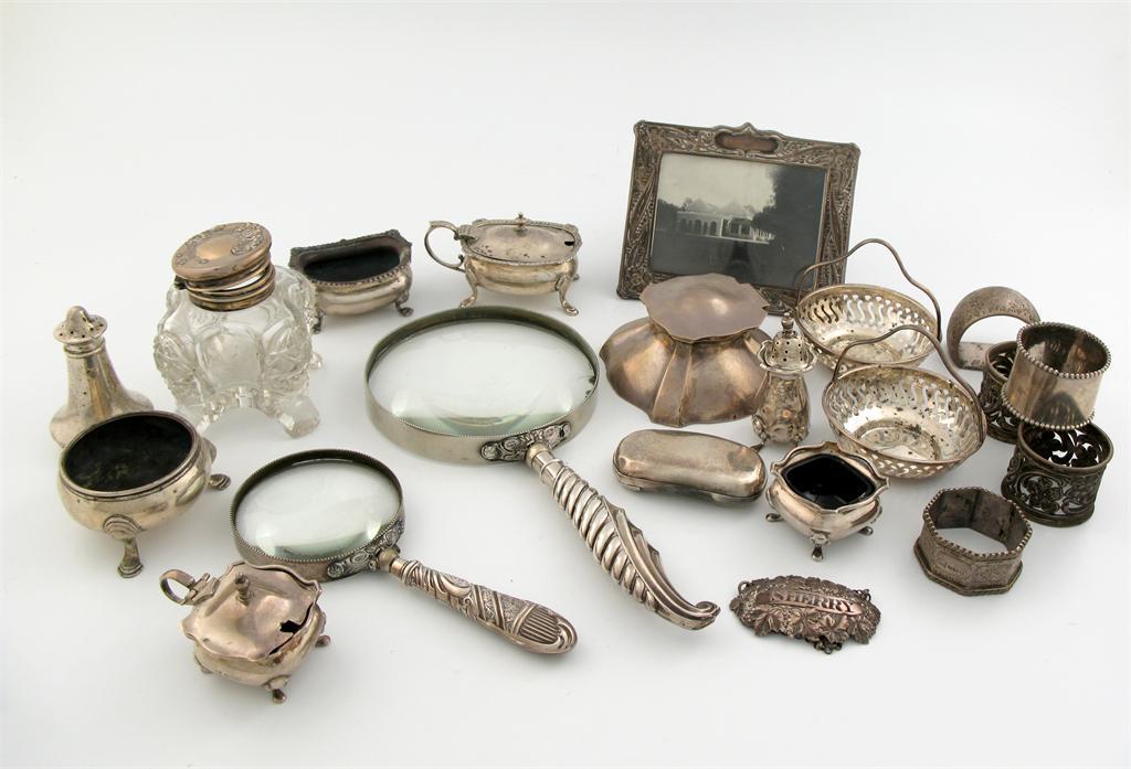 comprising: a photograph frame, Birmingham 1904, two silver handles magnifying glasses, an inkwell, a wine label pierced 'SHERRY' a silver mounted glass inkwell, a pair of baskets, a snuff box, a three-piece condiment set, two salt cellars, a mustard pot, a pepper pot, and five napkin rings, approx. weighable 16oz. (qty)