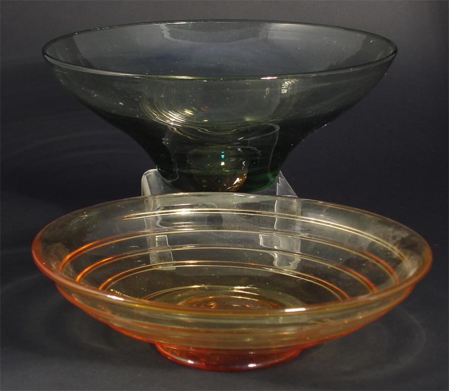 A Whitefriars Amber glass bowl designed by Tom Hill, ribbon trailed to the exterior on applied foot and another Whitefriars glass bowl unmarked 28.5cm. diam.