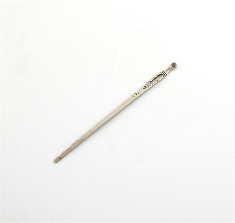 A 17th century silver bodkin, unmarked, circa 1670. tapering form, with a slot and 'cup' spatula, engraved decoration, with scratch initials 'AL' and 'FS', length 11.1cm, approx. weight 0.2oz. Purchased from Shredds, 17 January 1985.