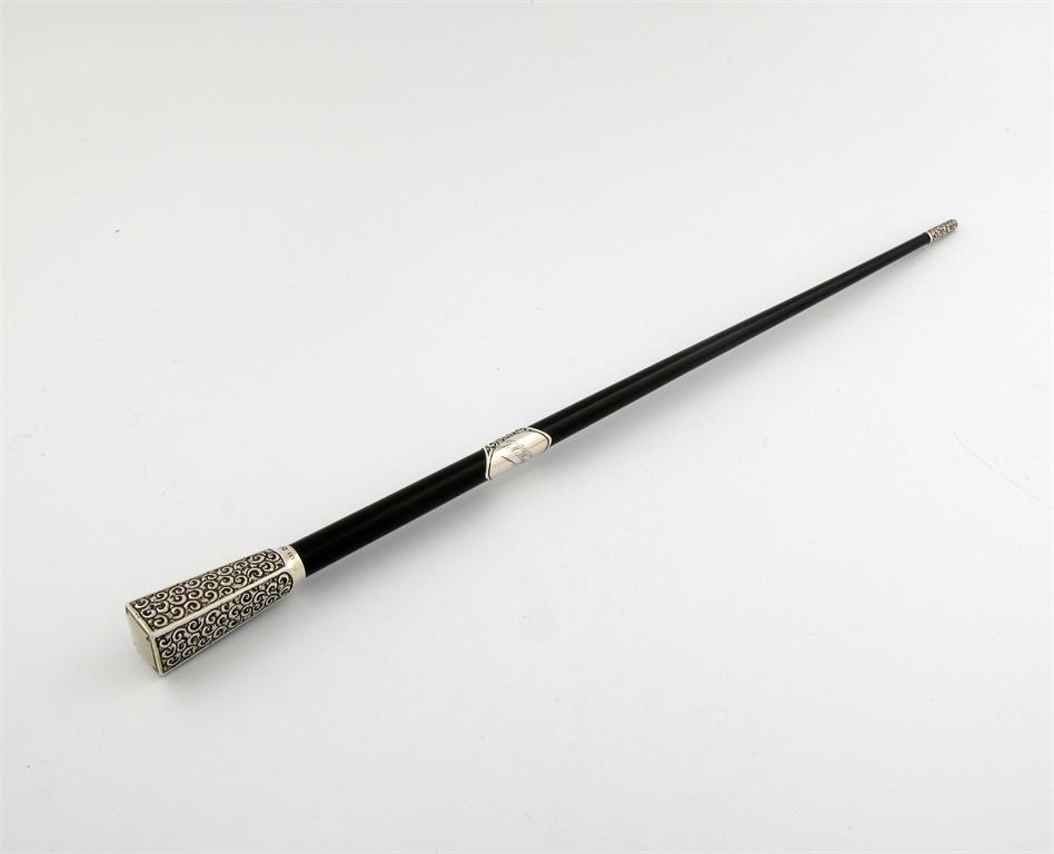 An Edwardian silver mounted conductor's baton, by E. Newman, London 1907, tapering ebonised shaft, the chased foliate scroll mounts, and with a tapering square finial, inscribed, length 52.2cm.