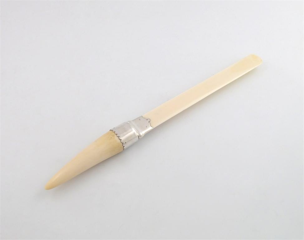 A silver mounted ivory tusk page turner, by E. Bennett and Co Limited, London 1920, plain silver mount and tusk handle, length 42.5cm.