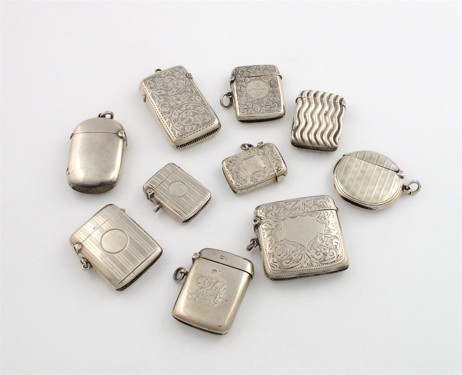 comprising: one of circular form, engine turned decoration, one with wavy edge fluted decoration, four with engraved foliate decoration, two plain and two with engine-turned decoration, approx. weight 8oz. (10)