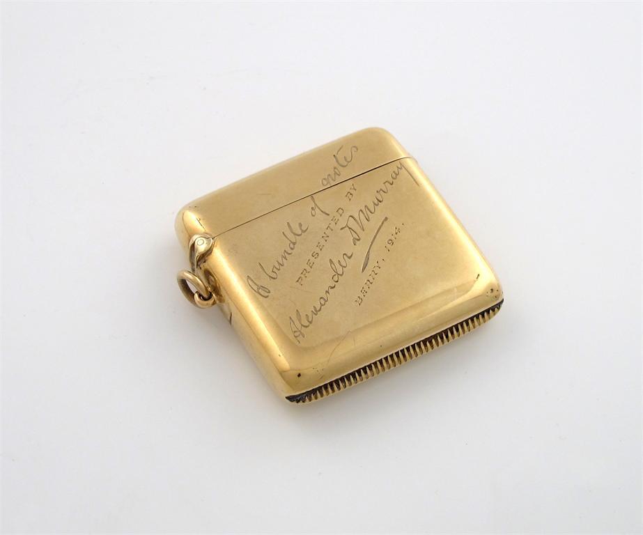 A 9 carat gold vesta case, by Deakin and Francis, Birmingham 1913, rectangular form, with a presentation inscription, length 4.3cm, approx. weight 28.6g.