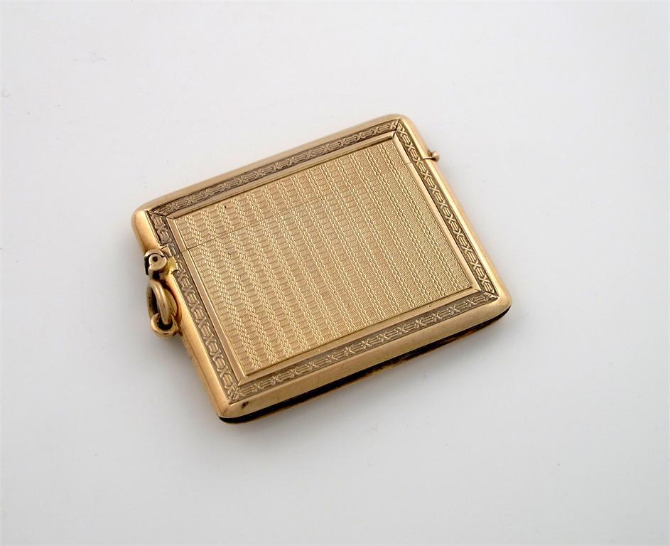 A 9 carat gold vesta case, by Joseph Walton and Co, London 1920, rectangular form, engine-turned decoration, length 5.2cm, approx. weight 37.6g.
