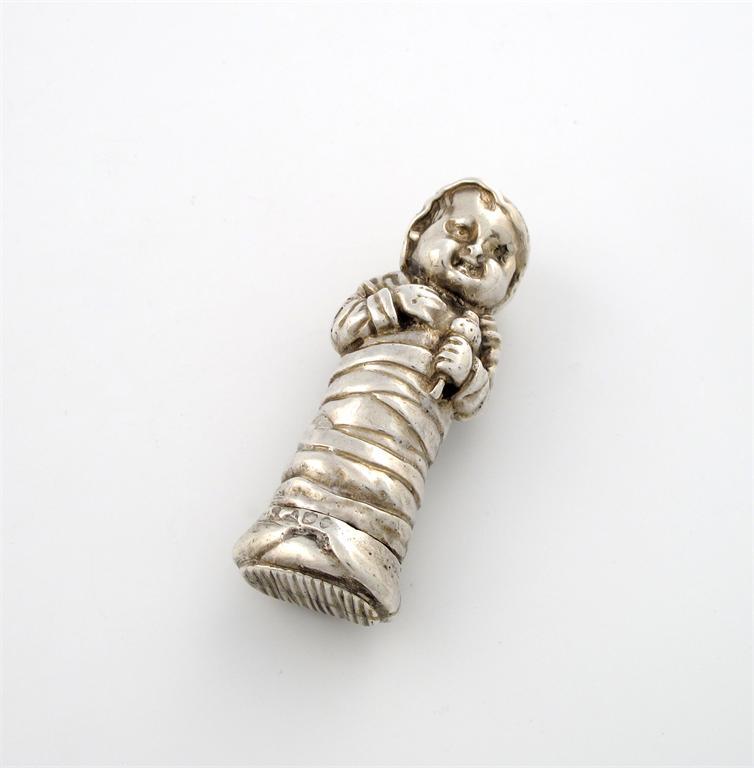 modelled as a baby in swaddling clothes and wearing a bonnet, the hinged cover inscribed, C. Main, Grand Hotel Abdeen', length 6.8cm, approx. weight 1.3oz.