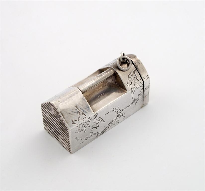 A Chinese novelty silver vesta case, by Wang Hing, modelled as a tool box, with engraved foliate decoration, length 5cm, approx. weight 1.2oz.