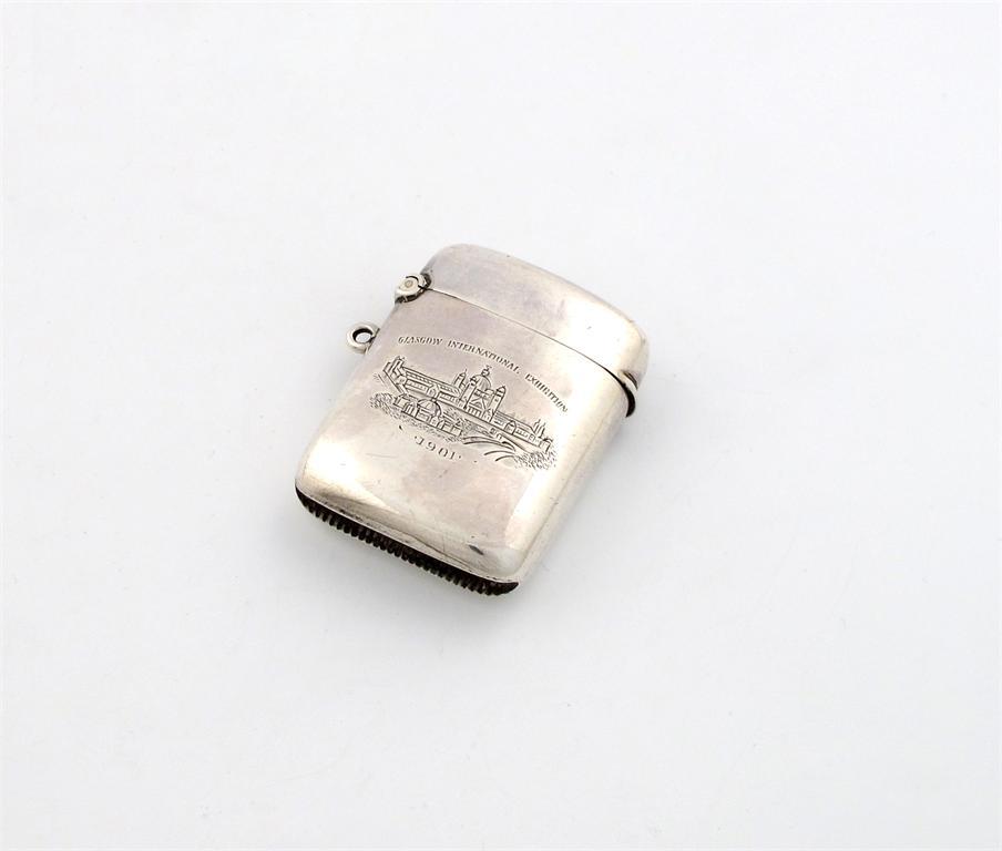 A late Victorian silver vesta case, by Deakin and Francis, Birmingham 1900, rounded rectangular form, engraved with scene of the New Art gallery and Museum and inscribed 'Glasgow International Exhibition 1901',the reverse monogrammed, length 4.5cm.