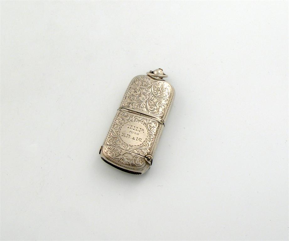 An Edwardian silver vesta / sovereign case, by William Neale and Sons, Chester 1907, rounded rectangular form, engraved foliate scroll decoration, inscribed, with a ring attachment, length 7.3cm, approx. weight 1.1oz.