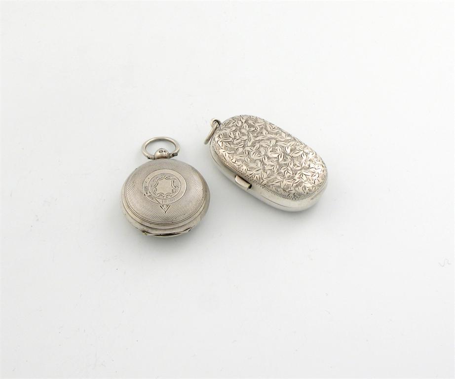 rounded rectangular form, engraved foliate scroll decoration, with a vacant shield cartouche, plus an Edwardian silver sovereign case, Birmingham 1901, circular form, engine-turned decoration, approx. weight 1.7oz. (2)