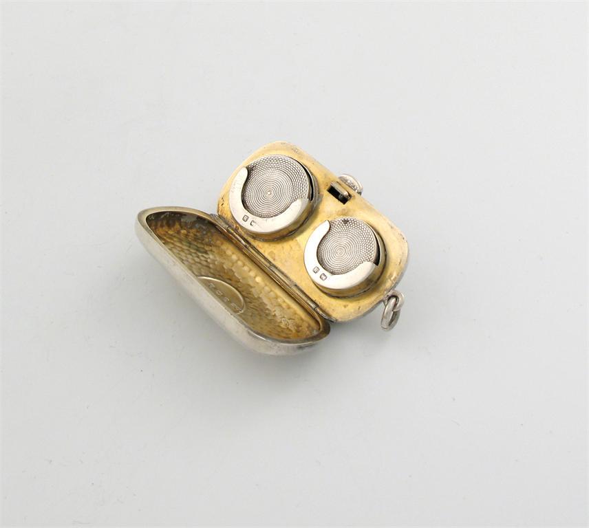 An Edwardian silver double sovereign case, by A and J Zimmerman, Birmingham 1907, rounded rectangular form, spot-hammered decoration, inscribed, with a ring attachment, length 6.6cm, approx. weight 1.5oz.