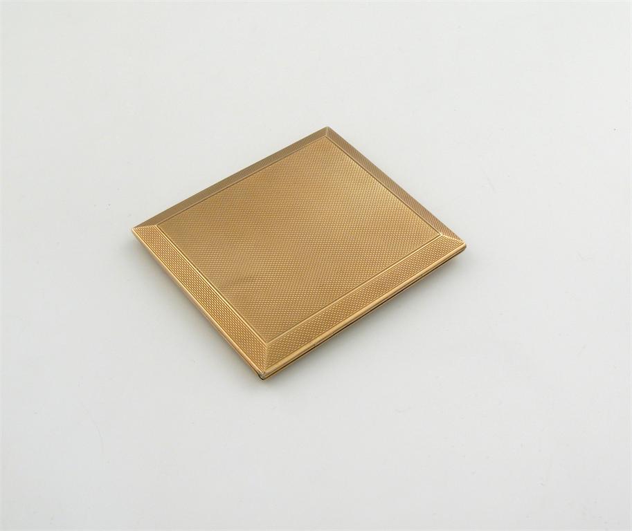 A 9 carat gold cigarette case, maker's mark worn, London 1937, rectangular form, engine turned decoration, initialled, length 8.8cm, approx. weight 100g.