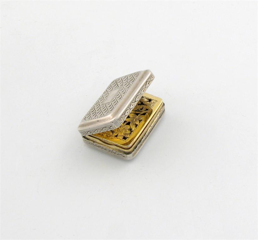 A George III silver vinaigrette, by John Shaw, Birmingham 1814, rectangular form, engraved decoration, the interior with a pierced foliate silver=gilt grille, length 3.6cm, approx. weight 0.7oz.