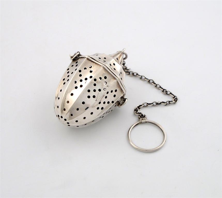 An American silver tea infuser, panelled urn form, hinged cover with a chain and finger ring, height 5.5cm.