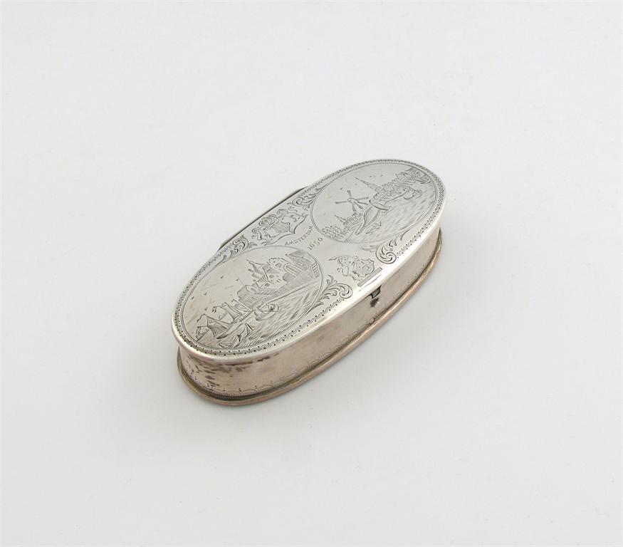 oval form, in the 17th century Dutch manner, the hinged cover engraved with two Dutch townscape scenes, and coat of arms, inscribed 'Amsterdam 1650', engraved borders and base, length 15.1cm, approx. weight 6oz.