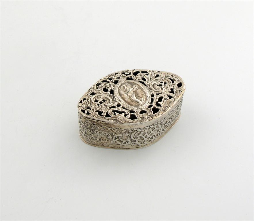 oval form, the hinged cover embossed and pierced with scroll-work, scroll sides, length 7.6cm, approx. weight 2.3oz.