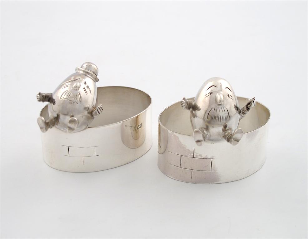 A pair of modern silver novelty napkin rings, by WW, Birmingham 1988, oval form mounted with humpty dumpty, length 4.5cm, approx. weight 1.5oz. (2)
