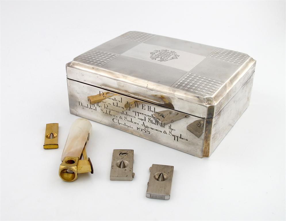 rectangular form, engine turned decoration, the hinged cover with a monogram, the front with a presentation inscription, length 21.3cm, the interior with four base metal cigar cutters. (5)