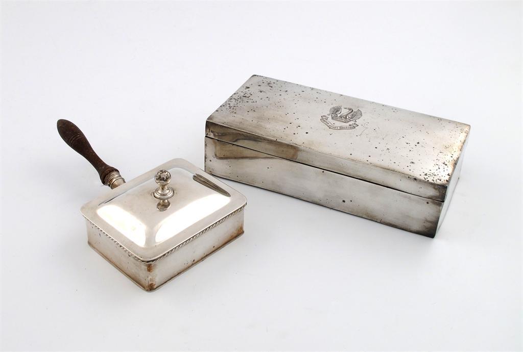 rectangular form, the domed cover with a ball finial, turned wooden baluster handle, length 17cm, plus a Victorian silver cigarette box, by Gibson and Langman, London 1887, of plain rectangular form, crested cover, approx. weighable 6oz. (2)