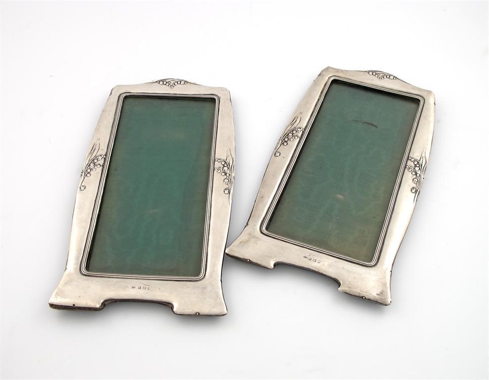 A pair of Edwardian silver photograph frames, by J. Gloster Limited, Birmingham 1908, rectangular form, embossed flower decoration, on bracket feet, easel backs lacking supports, height 29.5cm. (2)