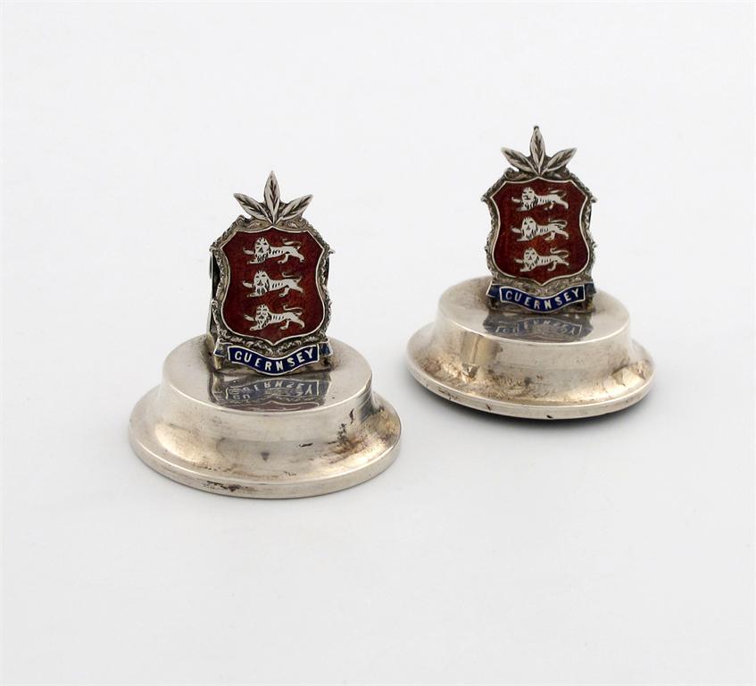 on circular bases applied with the enamel shield of Guernsey, height 3.7cm. (2)