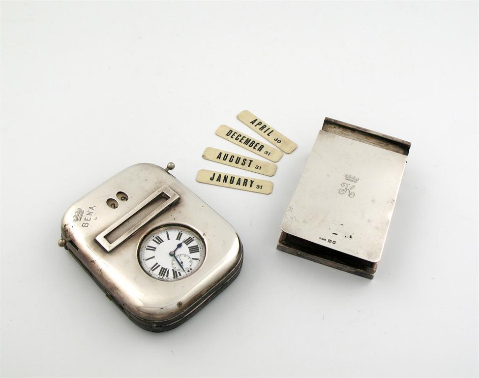 A silver mounted clock and calendar, by S and B, Birmingham 1910, rectangular form, leather easel back, height 12.5cm, plus an Asprey silver note pad, of rectangular form, spring hinged cover, initialled, London 1916. (2)
