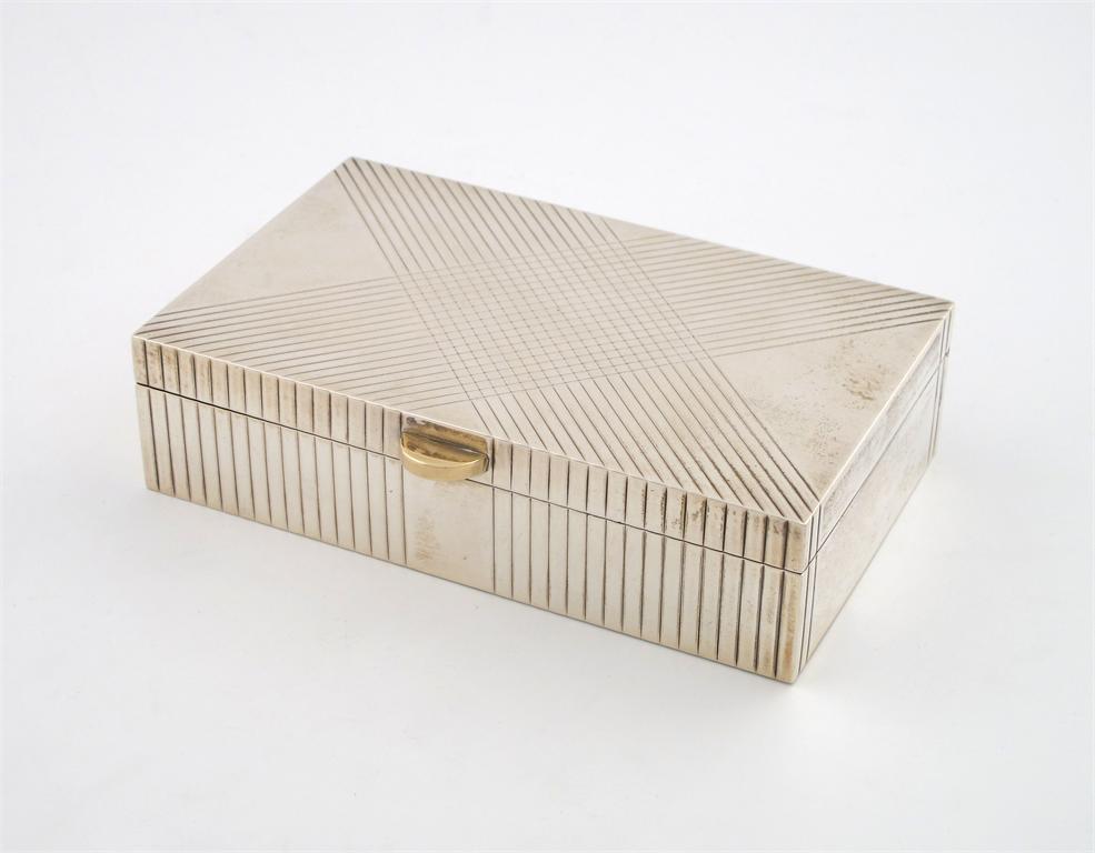 A silver cigarette box by Paget and Brown Limited, London 1954, rectangular form, with patterned fluted decoration, yellow thumb-piece, the interior inscribed, length 16.5cm.
