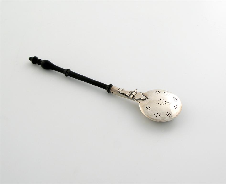 circular form, the hinged cover with pierced decoration, turned wooden baluster handle, length 16.1cm, approx. weight 0.4oz.