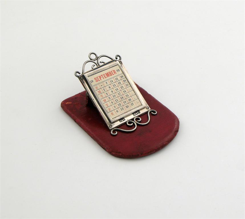 A late-Victorian silver desk clip / calendar, by Kelly Marshall and Company, Birmingham 1900, the sprung calendar of rectangular form, wire-work scroll mounts, on a red base, length 6.8cm.