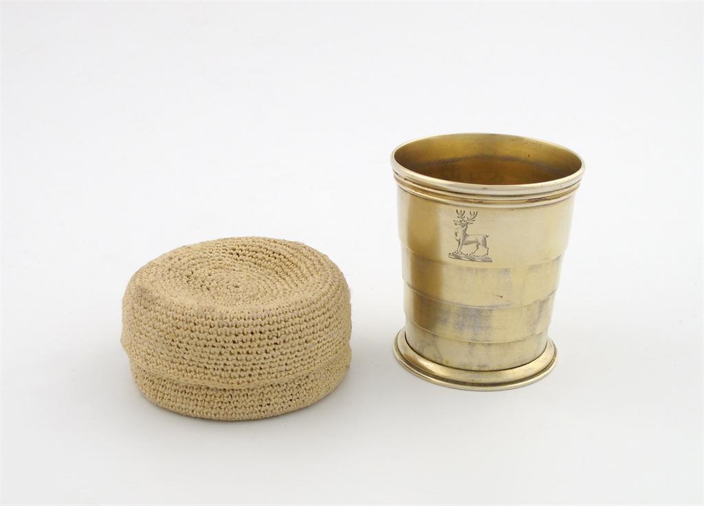 By Charles and George Asprey, a late-Victorian silver-gilt collapsible beaker, London 1890, tapering circular form, engraved with a crest, height 7.3cm, approx. weight 3.5oz.