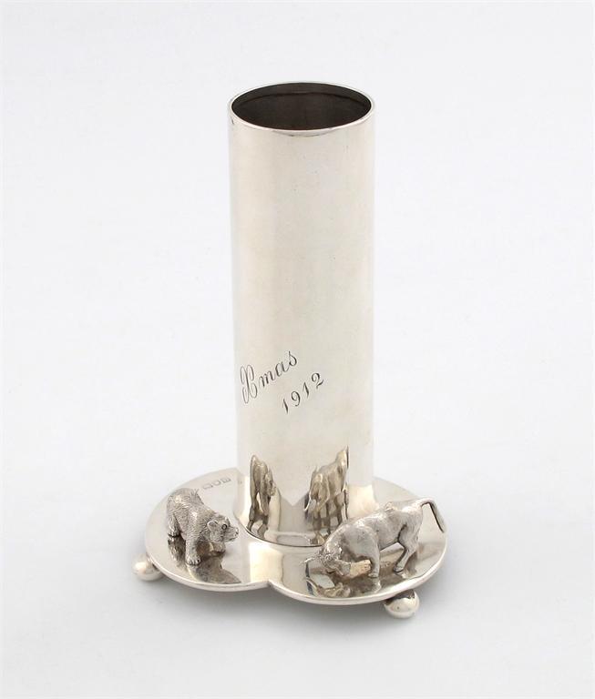 Stockmarket interest, an Edwardian silver taper stick holder, by William Wright, London 1908, cylindrical form, on a shaped oval base, mounted with a bull and a bear, on three bun feet, height 12cm, approx. weight 4oz.