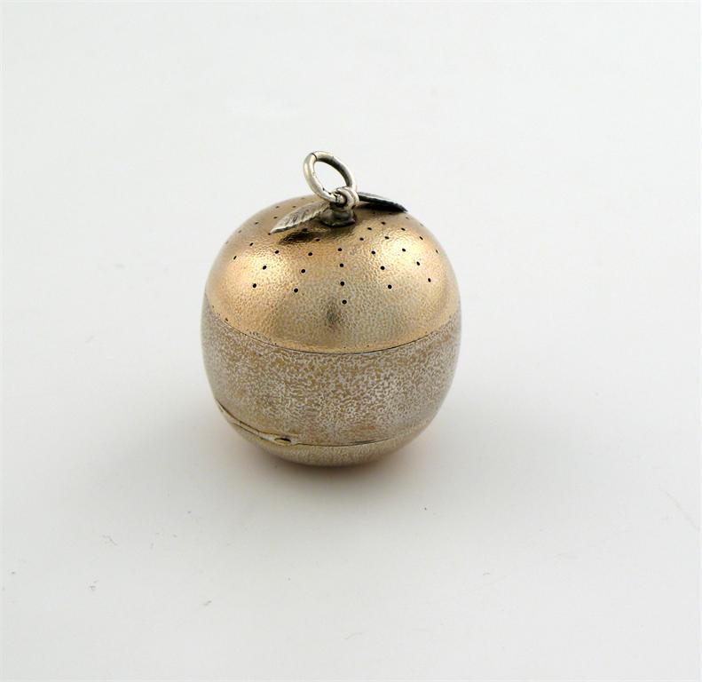 A novelty silver-gilt compact / vinaigrette, by Frank Hyams, London 1913, apple form, the pierced screw-off cover with a leaf and ring finial, the interior with a sponge and pull out cover, the hinged base opens to reveal a mirror, height 5.2cm.