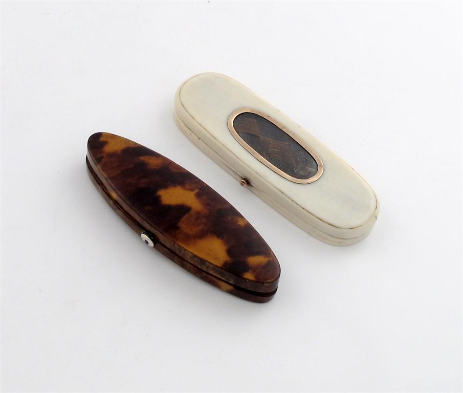 A George III tortoiseshell toothpick case, oval navette form, velvet lined, length 9cm, plus an ivory toothpick case, oblong form, the hinged cover set with a plaited hair memento within a gold surround, length 9.4cm. (2)