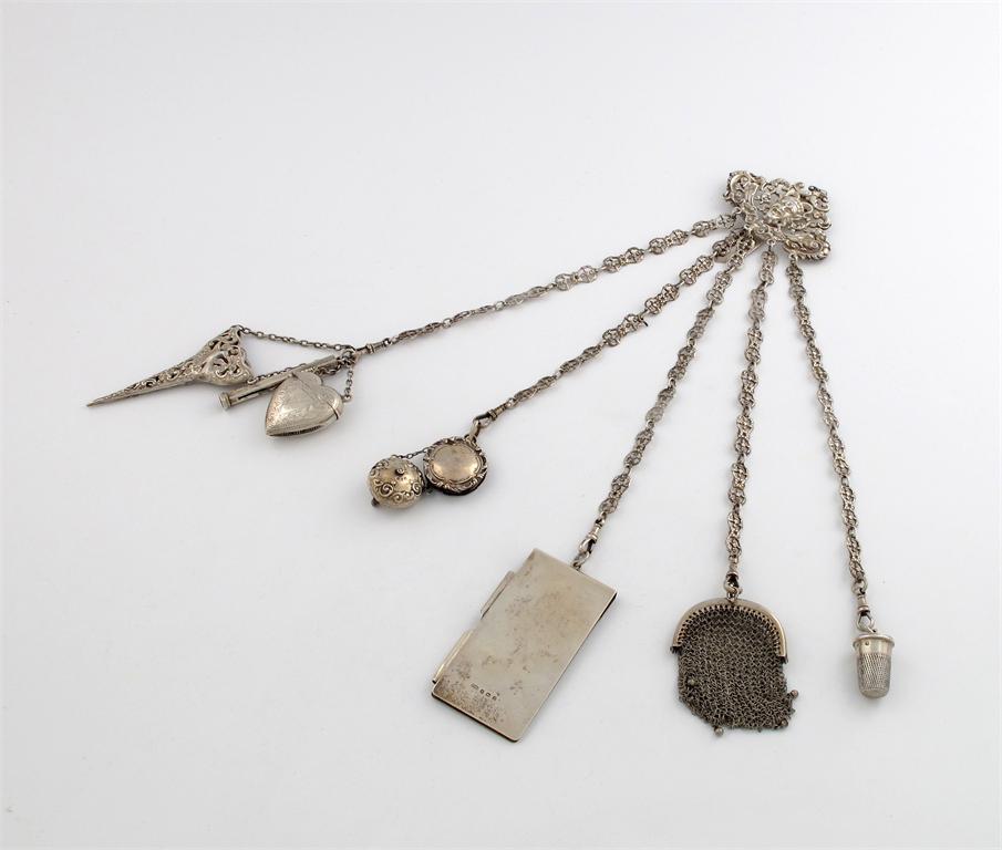 pierced foliate scroll decoration and embossed with a mask, with five hanging chains with various items, various dates and makers including: a notepad, a hear shaped vesta case, a scissor case, a pin wheel, a tape measure, a thimble with a telescopic interior, and a mesh purse, approx. weight 8oz.