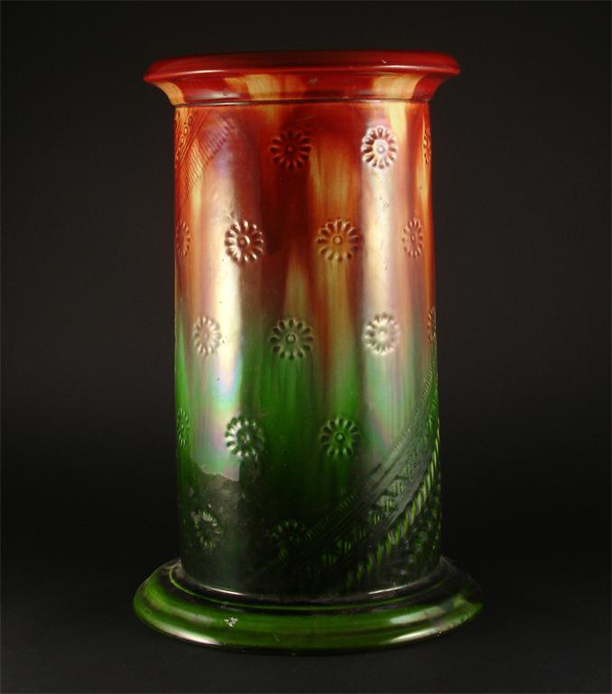 A pottery jardiniere stand probably Linthorpe designed by Dr Christopher Dresser, cylindrical form with impressed decoration in shades of red to green unmarked 38cm. high
