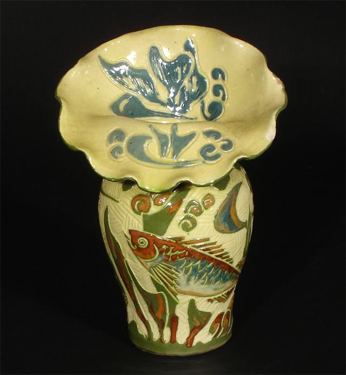 A Lauder Barum pottery vase incised with two scaly fish in shades of brown, blue and green on a yellow ground incised Lauder, Barum, small chips 17cm. high