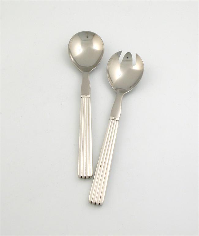 By Georg Jensen, a pair of Danish silver and stainless steel Bernadotte pattern salad servers, designed by Sigvard Bernadotte, length 23cm. (2)