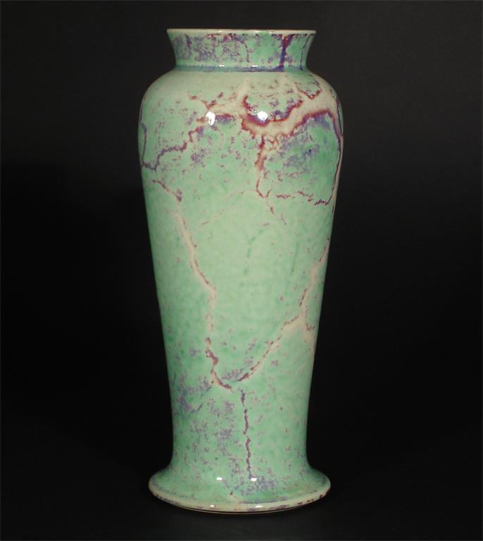A Ruskin Pottery high fired stoneware vase covered in a fissured turquoise and lavender glaze over white impressed mark, 1906, bruise to top rim 23.5cm. high
