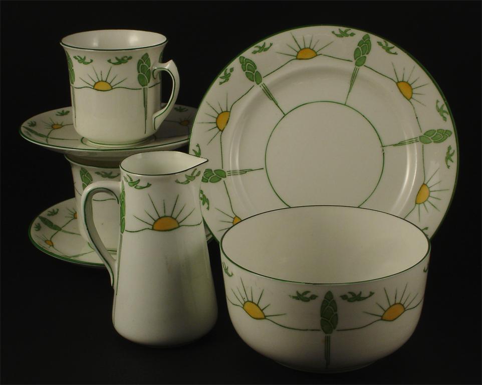 An Atlas China coffee set printed in green and yellow with a sunrise pattern