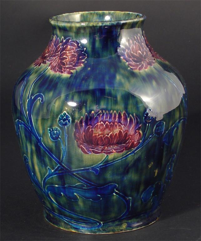 A Morrisware vase designed by George Cartlidge, pattern C3/1, tubeline decorated with clover flowers in purple on a mottled blue ground printed marks, facsimile signature impressed and painted model mark 18cm. high