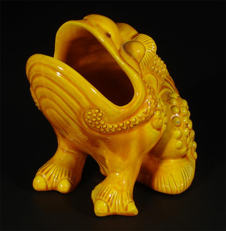 A Burmantoft's Faience grotesque bull frog model no.451, covered in a yellow glaze impressed marks, minor glaze nicks 13.5cm. high