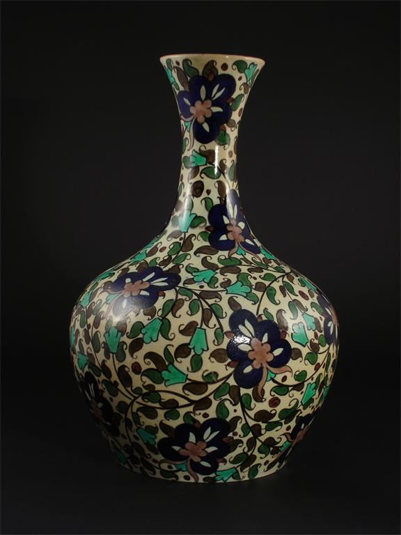 A Burmantoft's Faience Persian vase painted with floral motif in shades of blue, green and brown on a white ground impressed mark, painted Design 27, LK monogram, restoration to the top rim 42cm. high