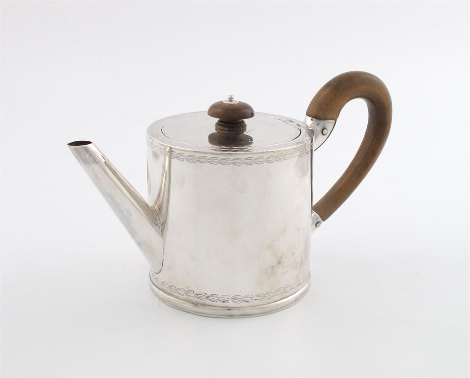 A George III silver teapot, by Charles Wright, London 1775, circular drum form, scroll handle, flush hinged cover, bright-cut foliate borders, worn crest, height 12.8cm, approx. weight 14oz.